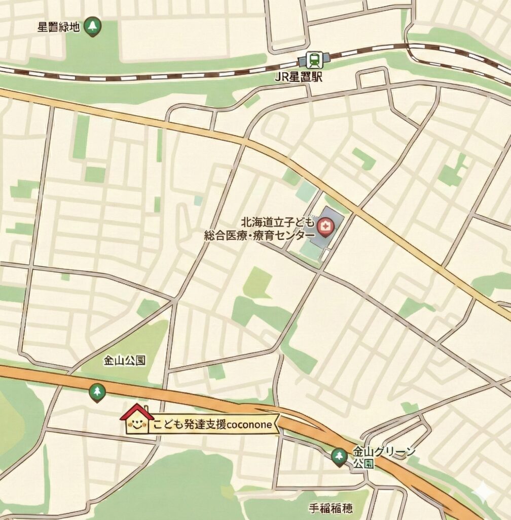 近隣には手稲西小学校や札幌市立手稲西中学校、イムス札幌内科リハビリテーション病院があり、地域に根ざした環境です。スクールゾーンに面しており、道路も広くバリアフリー対応で、車椅子やベビーカーでも安心してご来所いただけます。